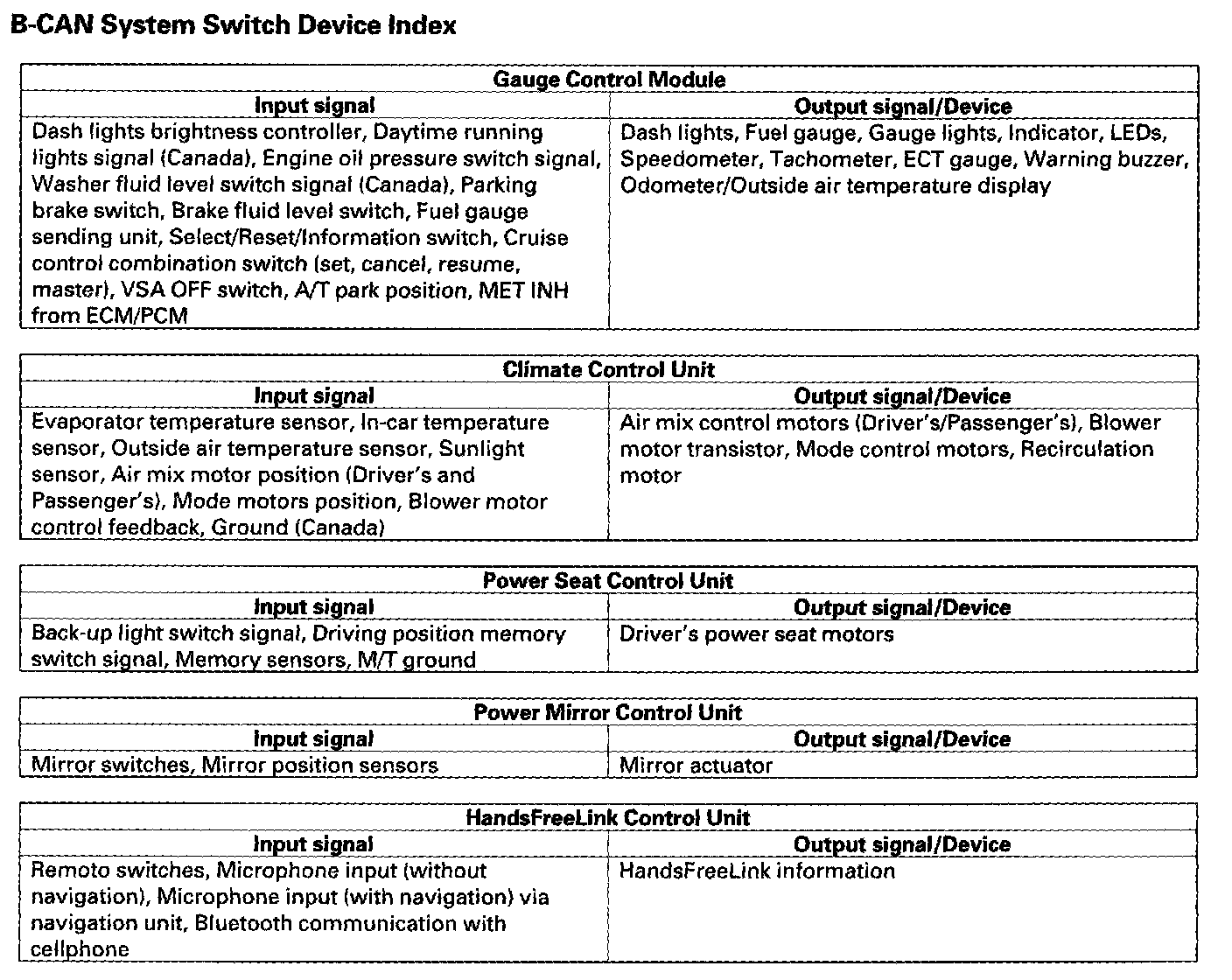 - HandsFreeLink control unit self-diagnostic function.