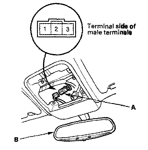2. Disconnect the 3P connector (A) from the automatic dimming inside mirror (B).