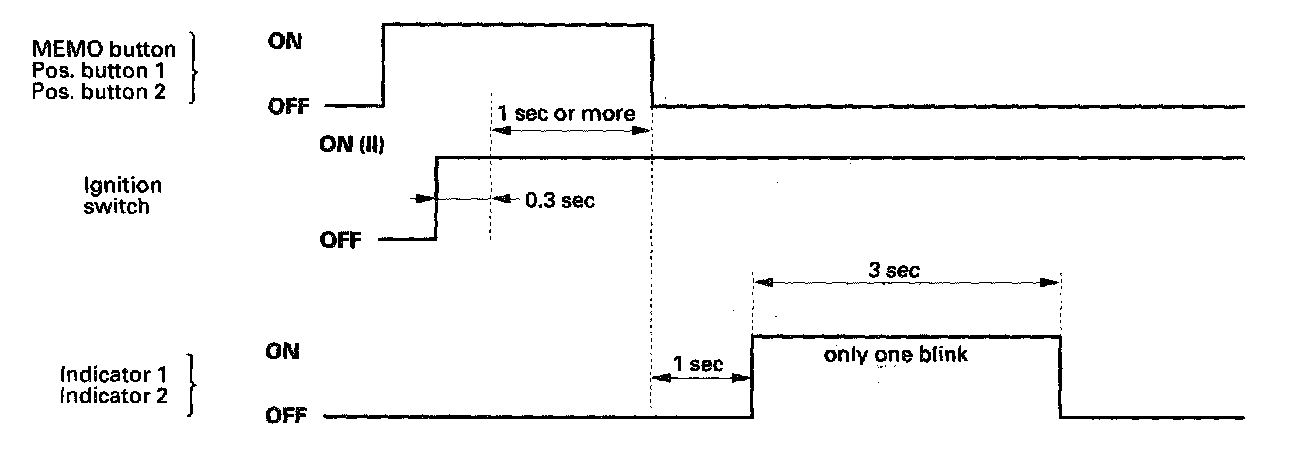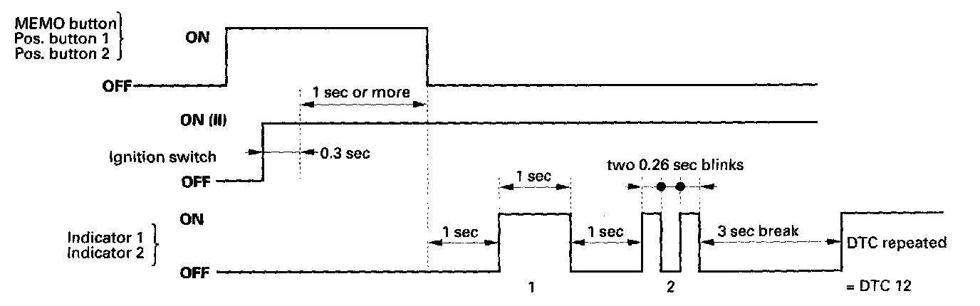 General Troubleshooting InformationThe self-diagnostic function of the driving position memory system detects system problems. This information can be retrieved by displaying diagnostic trouble code on the driving position memory switch indicator.