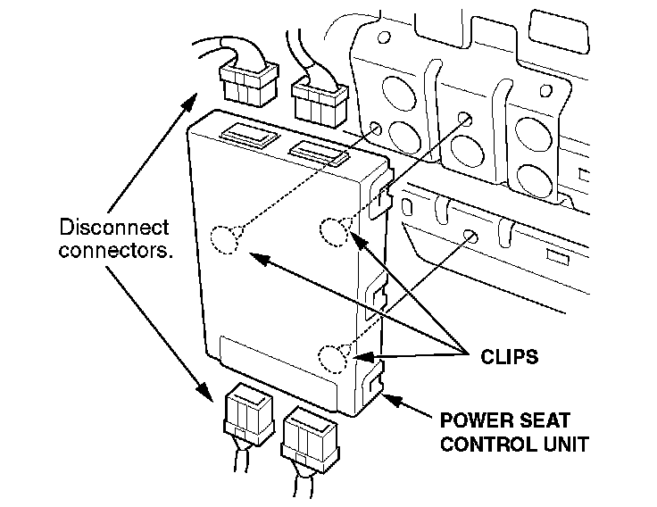 3. Disconnect the four connectors from the power seat control unit, then pull down on the control unit to release the clips, and remove it from the seat.