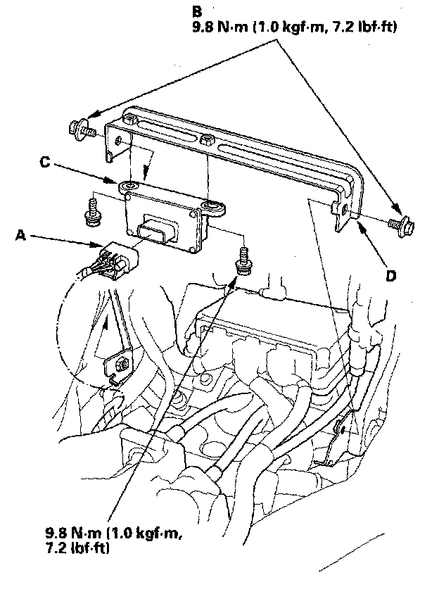 4. Remove the yaw rate-lateral acceleration sensor (C) with the bracket (D).