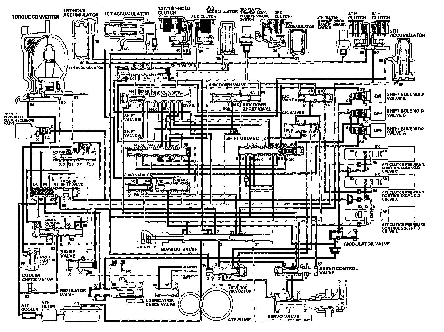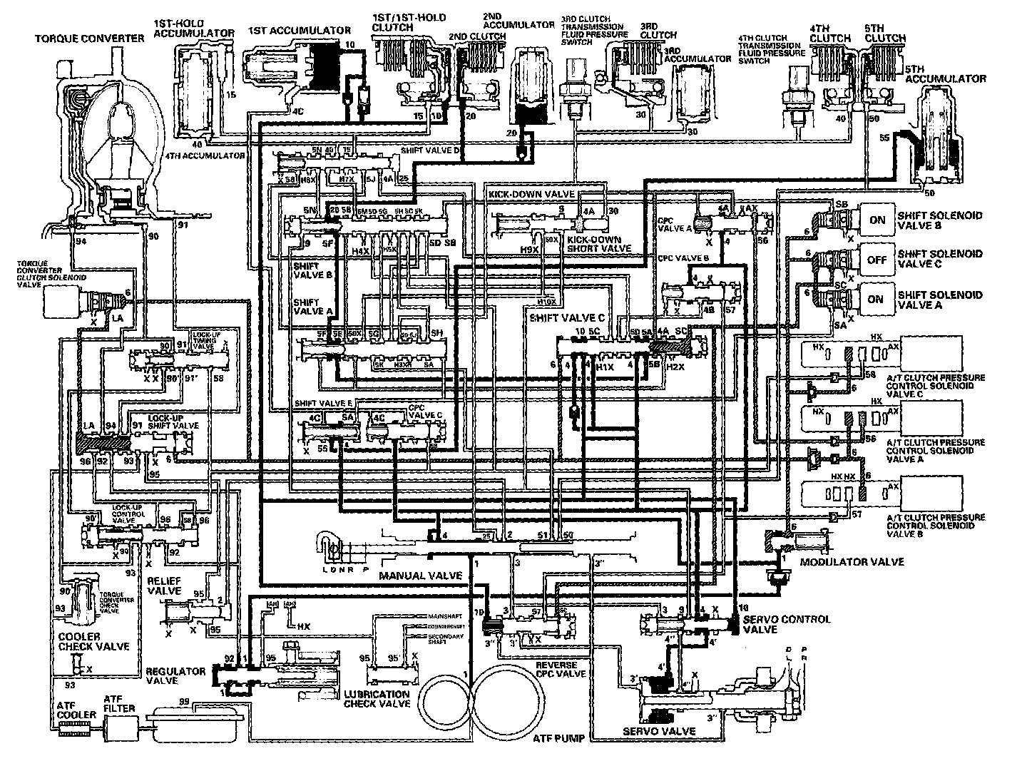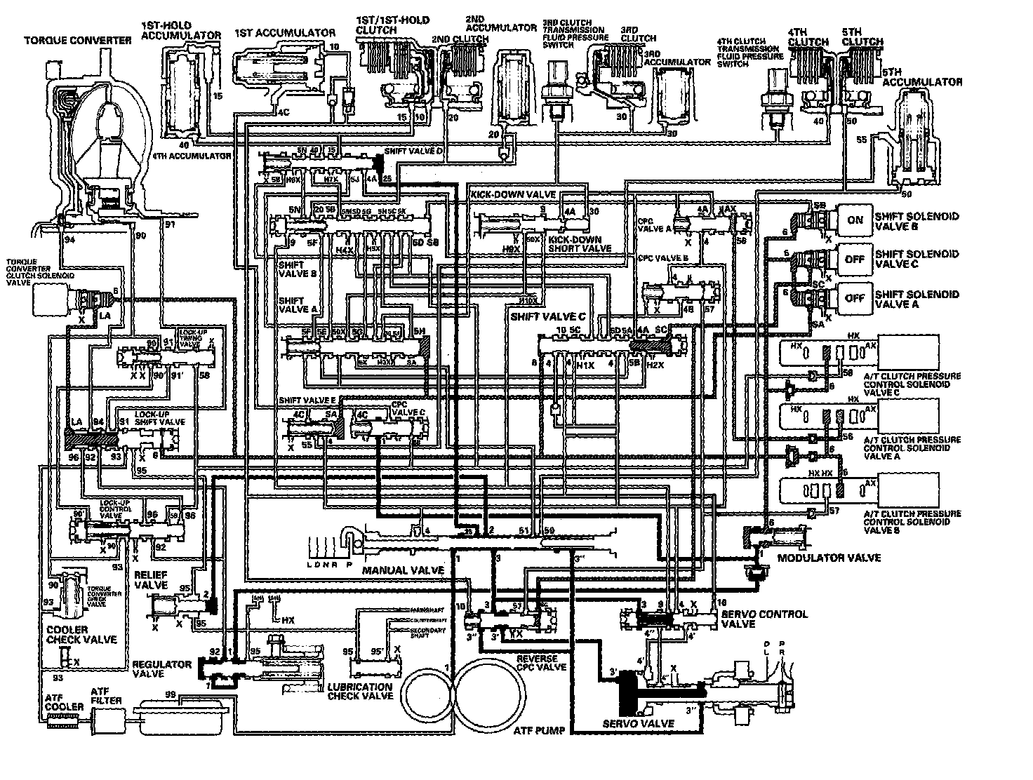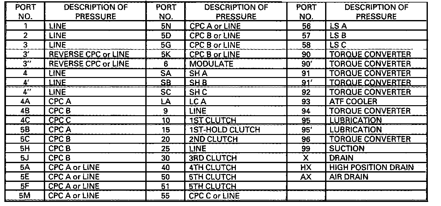 When the R position is selected while the vehicle is moving forward at speeds over 6 mph (10 km/h), the PCM outputs to turn shift solenoid valves A and C ON; and shift solenoid valve B remains ON. The reverse CPC valve is moved to right side and covers the port to stop the line pressure (3') to the servo valve. The line pressure (3') is not applied to the servo valve, and the 5th clutch pressure (50) is not applied to the 5th clutch. As a result, power is not transmitted to the reverse position.