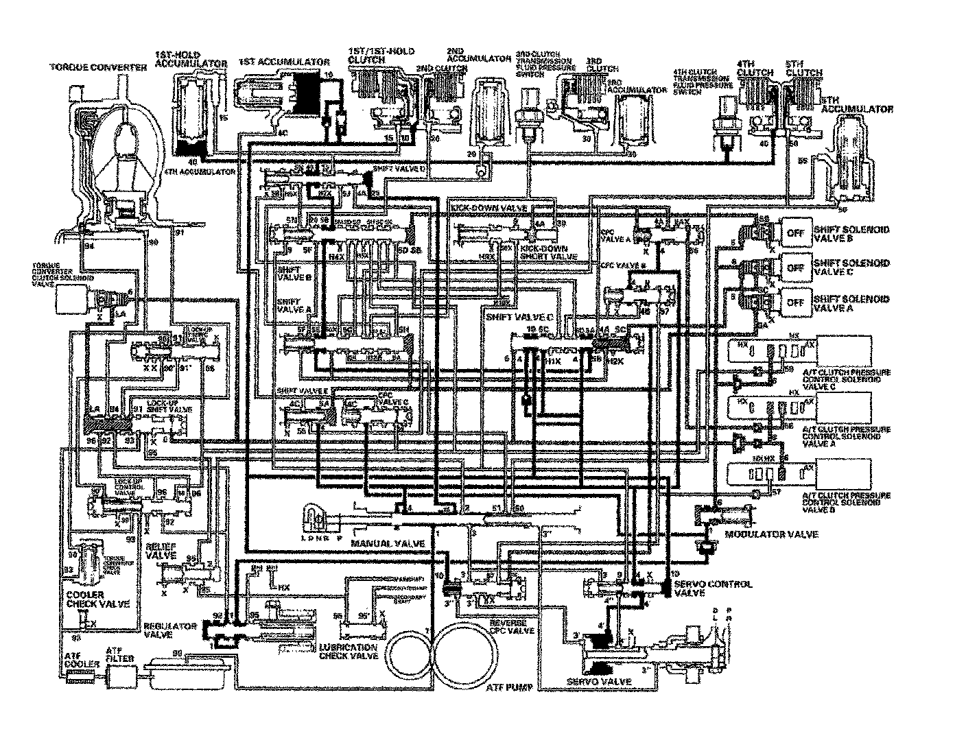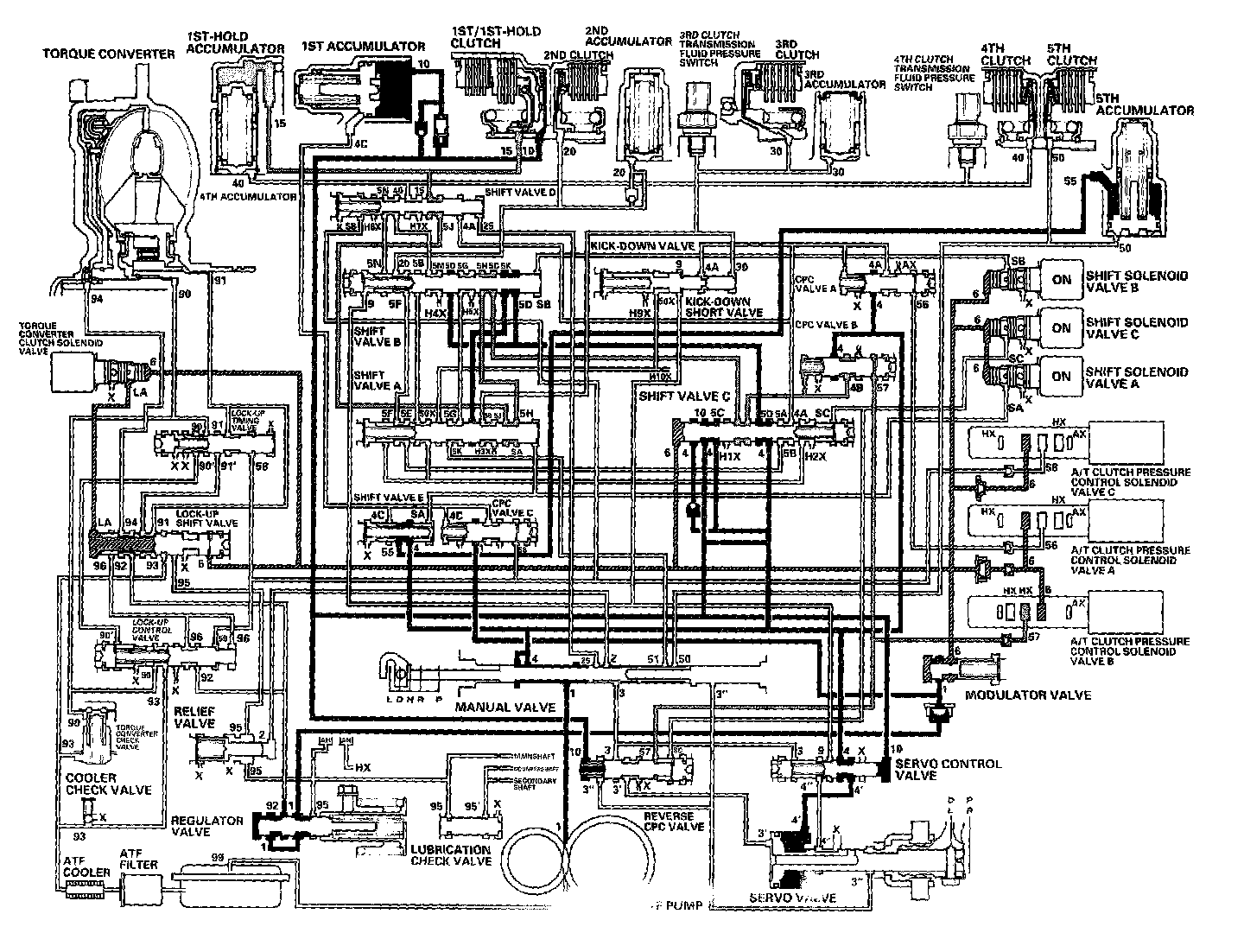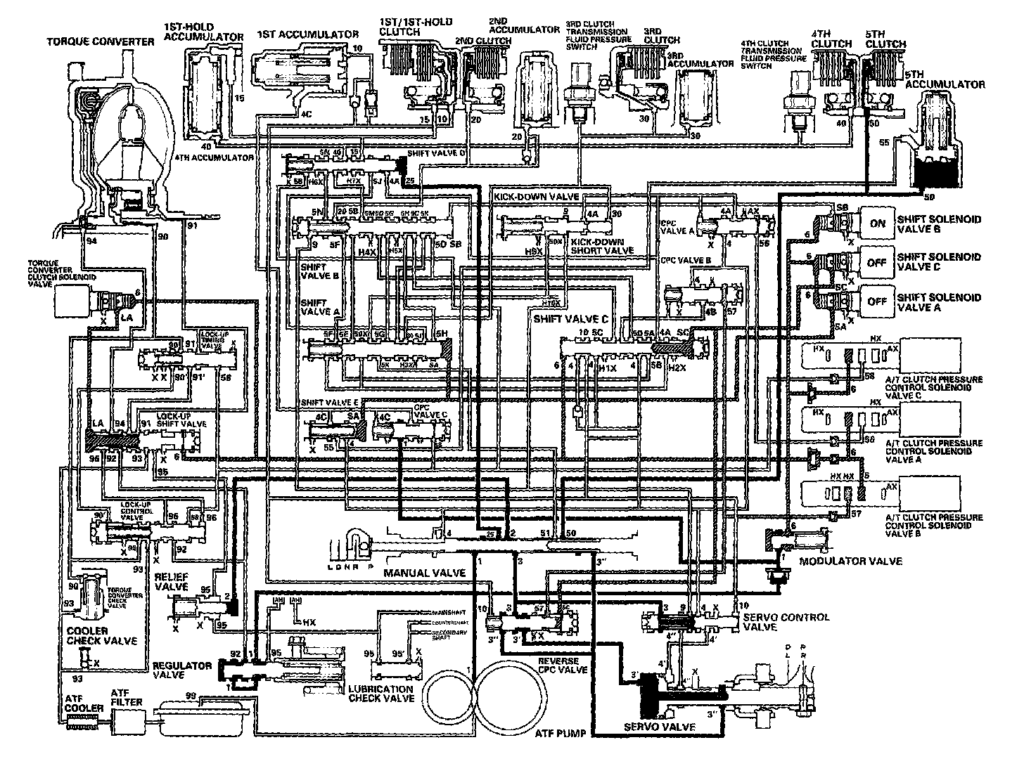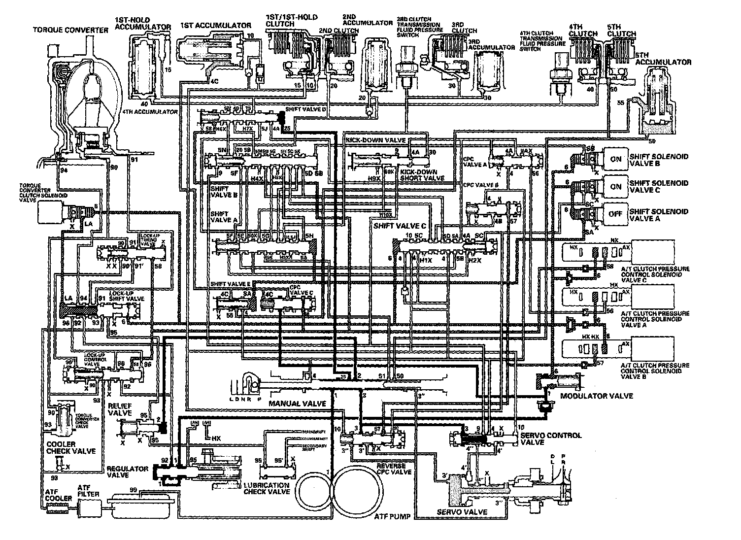 When the R position is selected while the vehicle is moving forward at speeds over 6 mph (10 km/h), the PCM outputs to turn shift solenoid valves A and C ON; and shift solenoid valve B remains ON. The reverse CPC valve is moved to right side and covers the port to stop the line pressure (3') to the servo valve. The line pressure (3') is not applied to the servo valve, and the 5th clutch pressure (50) is not applied to the 5th clutch. As a result, power is not transmitted to the reverse position.