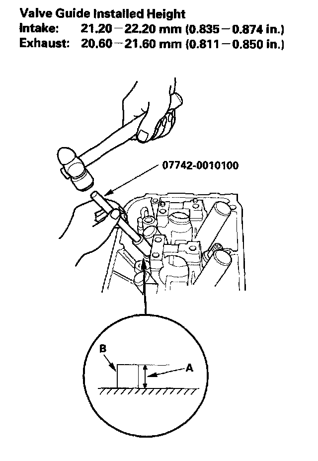 9. Apply a thin coat of clean engine oil to the outside of the new valve guide. Install the guide from the camshaft side of the head; use the special tool to drive the guide to the specified installed height (A) of the guide (B). If you have all 12 guides to do, you may have to reheat the head.