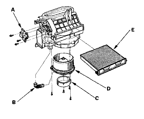 - The recirculation control motor (A), blower motor cooling hose (B), blower motor cover (C), the blower motor (D), and the dust and pollen filter (E) can be replaced without removing the blower unit.