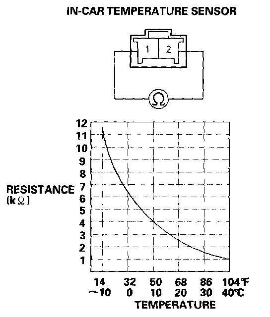 3. Compare the resistance reading between the No.1 and No.2 terminals of the in-car temperature sensor with the specifications shown in the graph; the resistance should be within the specifications.