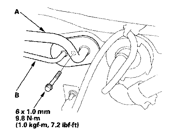 2. Remove the bolt, then disconnect the suction line (A) and the receiver line (B) from the evaporator