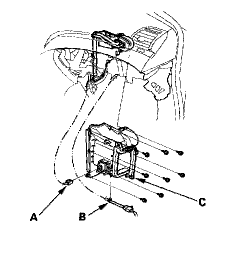 6. Disconnect the connector (A) from the power transistor, then remove the wire harness clip (B) the self-tapping screws, and the expansion valve cover (C).