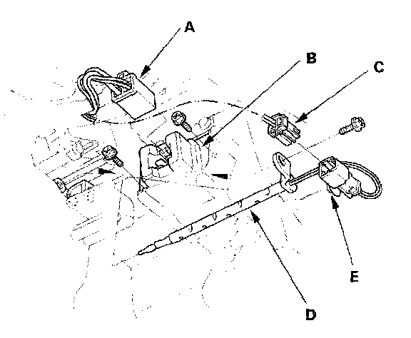 2. Disconnect the 4P connector (A) from the power transistor then remove the self-tapping screws and carefully pull out the power transistor (B). Disconnect the 2P connector (C) from the evaporator temperature sensor (D), then remove the connector clip (E). Remove the self-tapping screw, and carefully pull out the evaporator temperature.