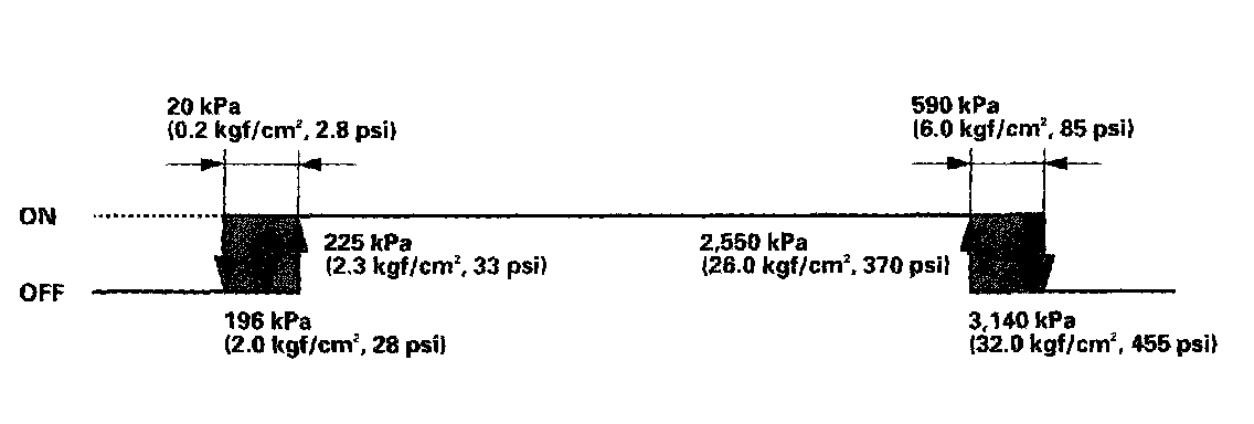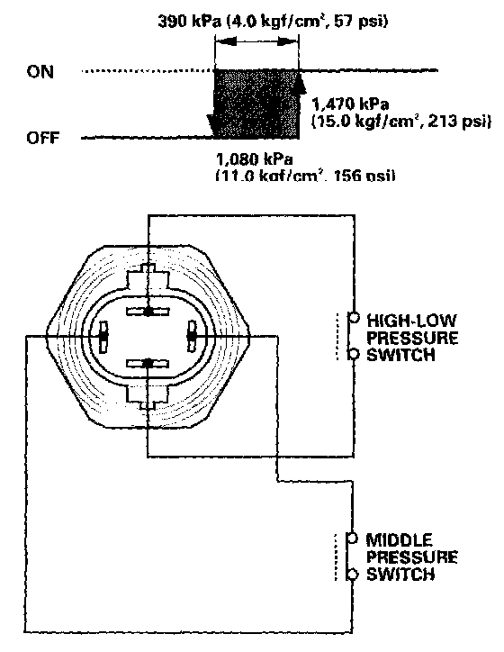 If the refrigerant pressure goes above 1,470 kPa (15.0 kgf/sq.cm, 213 psi), the A/C pressure switch closes to signal the ECM/PCM to change the speed of the condenser fan and radiator fan to high when the refrigerant pressure drops below 1,075 kPa (10.1 kgf/sq.cm, 156 psi), the A/C pressure switch opens to signal the ECM/PCM to change the speed of the condenser fan and radiator fan to low.