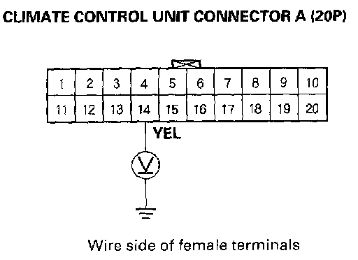 10. Measure the voltage between the No.14 terminal of climate control unit connector A (20P) and body ground.