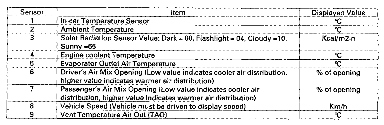 Displaying Sensor Inputs at the Climate Control UnitThe climate control unit has a mode that displays sensor inputs it receives. This mode shows you what the climate control unit is receiving from each of the sensors, one at a time, and it can help you determine if a sensor is faulty.