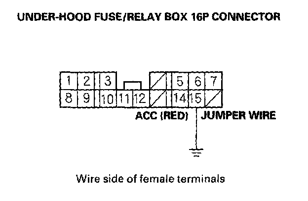 9. Momentarily connect under-hood fuse/relay box 16P connector terminal No.15 to body ground with a jumper wire several times.