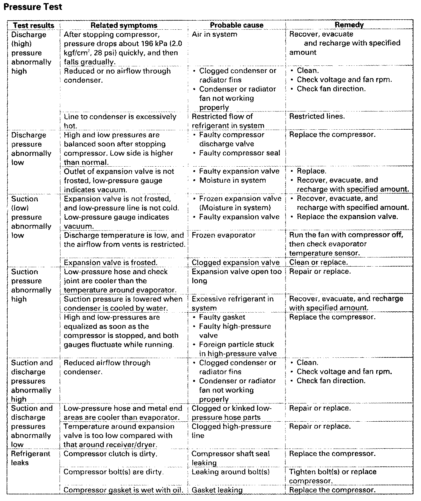 7. After running the air conditioning for 10 minutes under the above test conditions, read the delivery temperature from the thermometer in the center vent, the intake temperature near the blower unit, and the discharge (high) and suction (low) pressures on the A/C gauges.