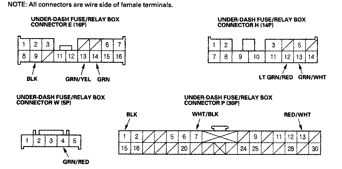 6. Reconnect the connectors to the under dash fuse/relay box Turn the ignition switch ON (II), and make these input tests at the appropriate connectors on the under-dash fuse/relay box