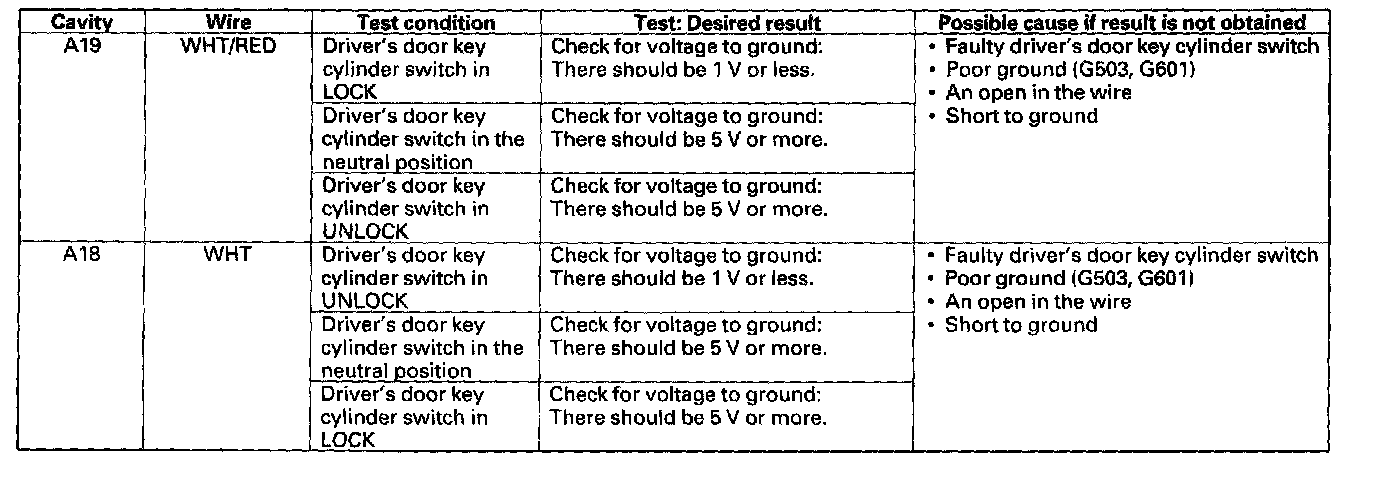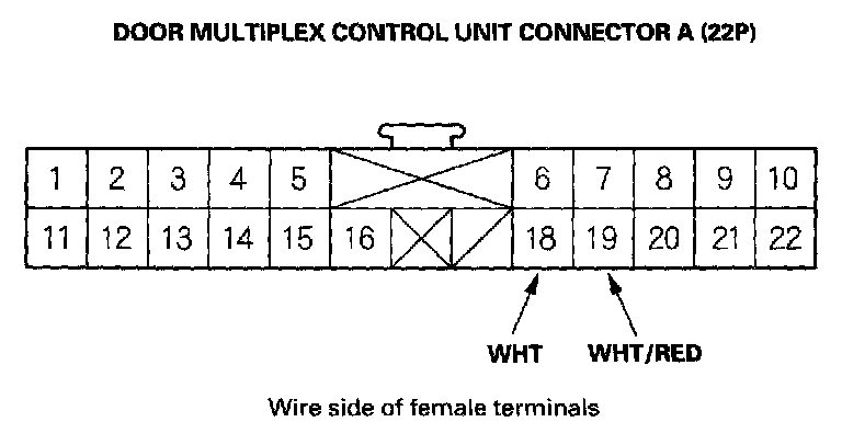11. Reconnect the connector to the door multiplex control unit. Turn the ignition switch ON (II), and make these input tests at the appropriate connector.