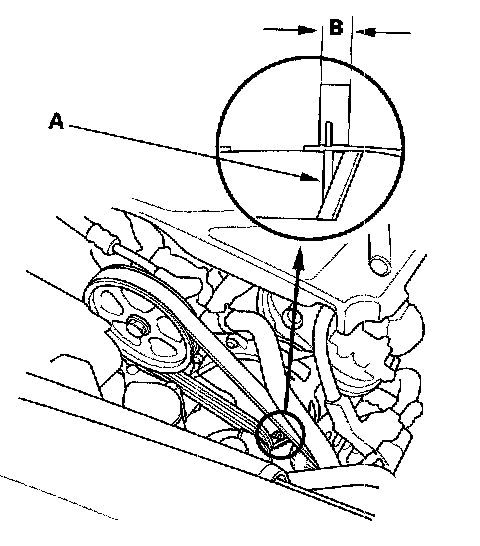 3. Check that the auto-tensioner indicator (A) is within the standard range (B) as shown. If it is out of the standard range, replace the drive belt.