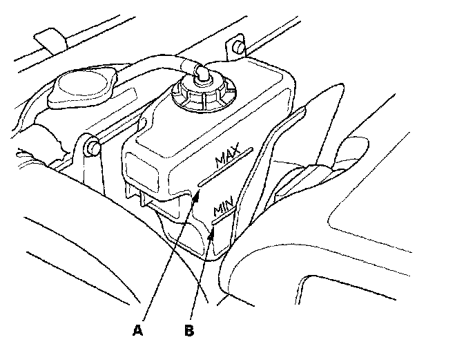 1. Look at the coolant level in the coolant reservoir. Make sure it is between the MAX mark (A) and MIN mark (B).