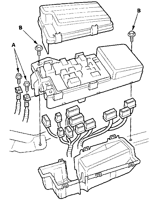 5. Remove the two mounting bolts (B) from the under-hood fuse/relay box.