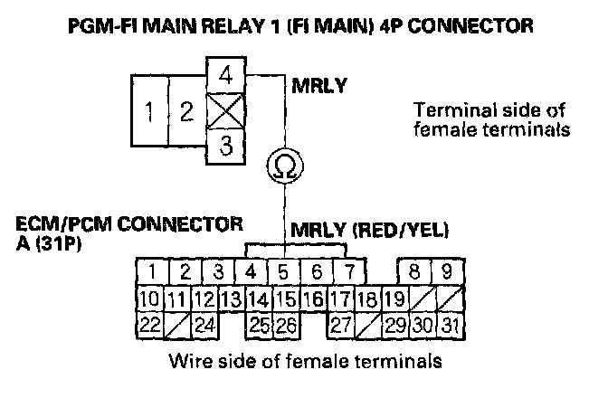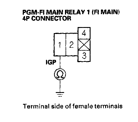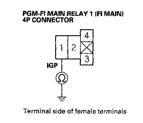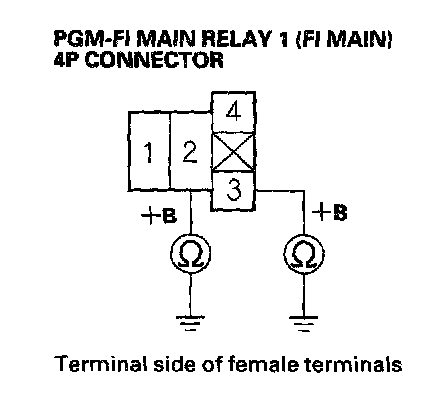 27. Check for continuity between body ground and PGM-FI main relay 1 (FI MAIN) 4P connector terminals No.2 and No.3 individually.