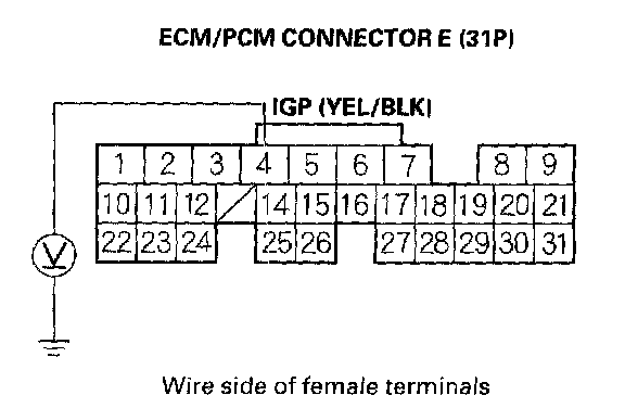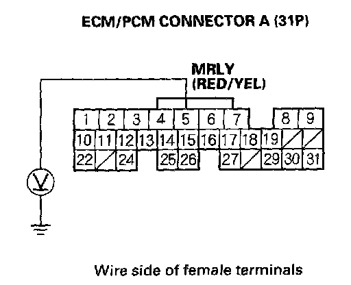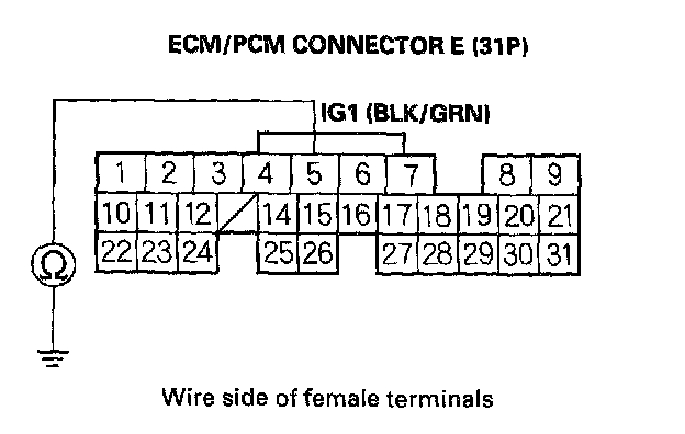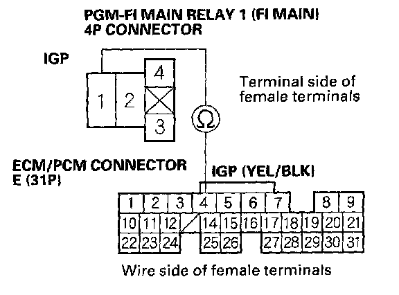 30. Check for continuity between PGM-FI main relay 1 (FI MAIN) 4P connector terminal No.1 and body ground.