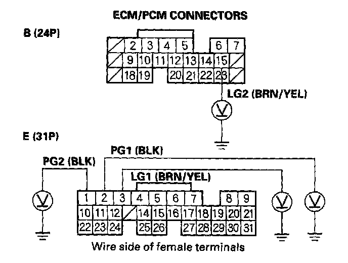 62. Measure voltage between body ground and ECM/PCM connector terminals B15, E1, E2, and E3 individually.