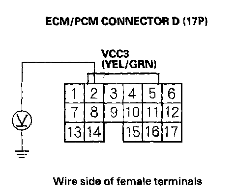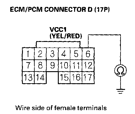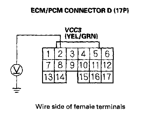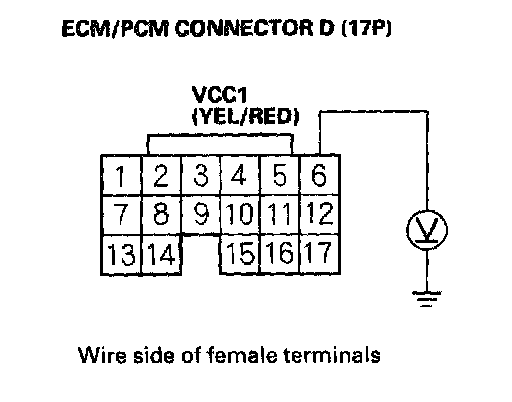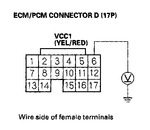 65. Disconnect the connector from each of these sensors, one at a time, and measure voltage between ECM/PCM connector terminal D6 and body ground with the ignition switch ON (II).