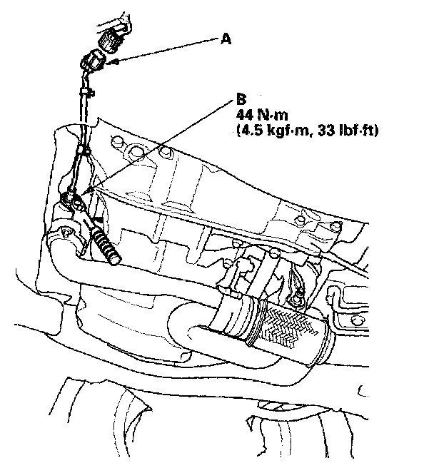 1. Disconnect the front secondary HO2S 4P connector (A), then remove the front secondary HO2S (B).