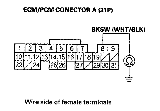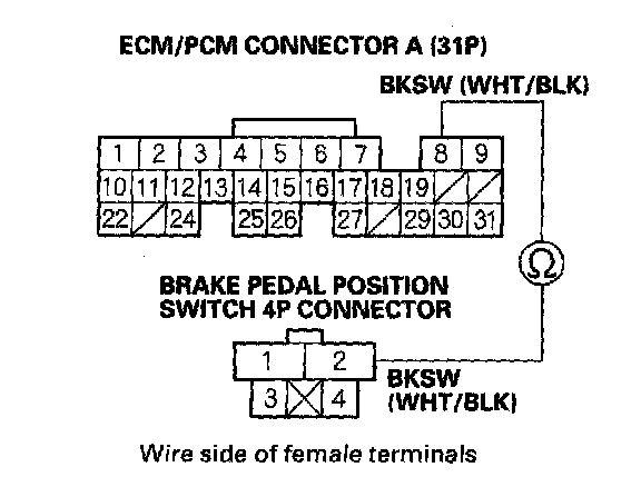 9. Check for continuity between ECM/PCM connector terminal A8 and brake pedal position switch 4P connector terminal No.2.