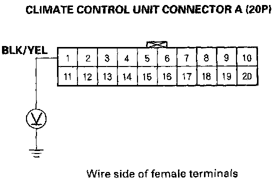 4. Measure the voltage between the No.1 terminal of climate control unit connector A (20P) and body ground.