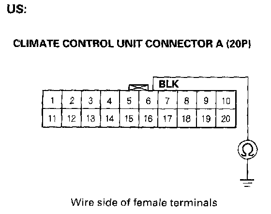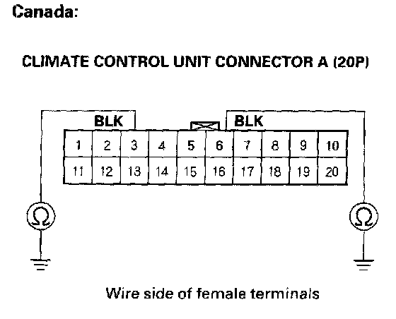 6. Check for continuity between the No.3 (Canada) and No.6 terminal of climate control unit connector A (20P) and body ground.