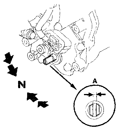 7. Align the cutouts (A) on the rotary-frame with the neutral positioning cutouts (B) on the transmission range switch (C) then put a 2.0 mm (0.08 inch) feeler gauge blade (D) in the cutouts to hold the switch in the N position.