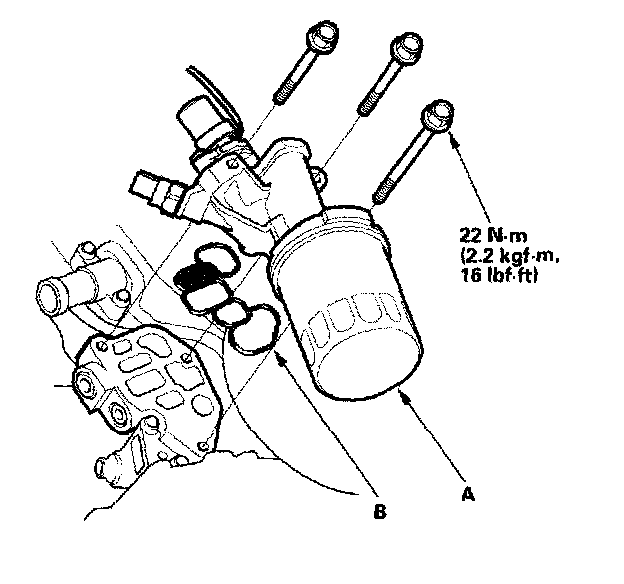 3. Remove the VTEC solenoid valve/oil filter assembly (A) from the oil pump, and check the VTEC solenoid valve filter (B) for a restriction. If there is a restriction, replace the VTEC solenoid valve filter, the engine oil filter, and the engine oil.