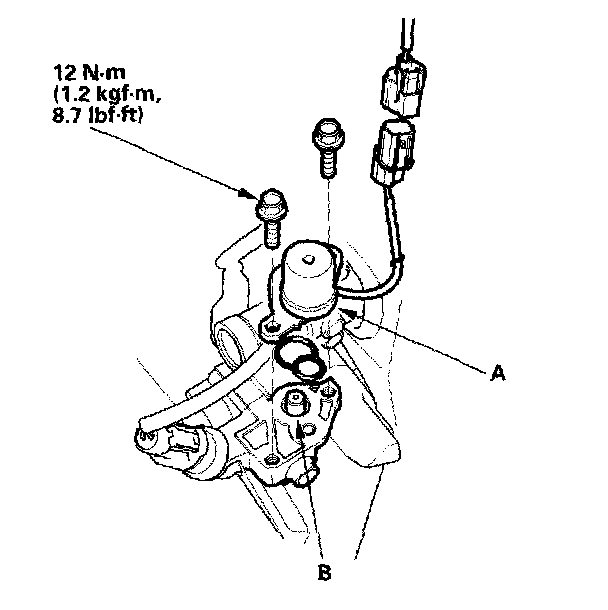4. If the filter is not restricted, remove the VTEC solenoid valve (A) and push the valve (B) with your finger to check its movement. If the valve moves freely, it is normal, check the engine oil pressure. If the valve binds or sticks, replace the VTEC valve assembly.