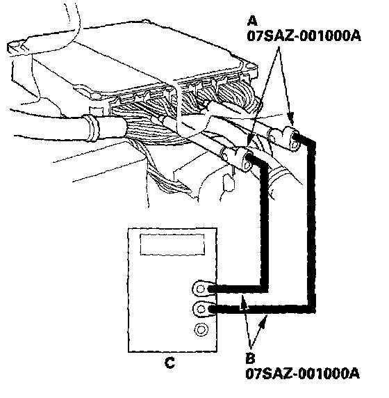 3. Connect the backprobe adapters (A) to the stacking patch cords (B), and connect the cords to a multimeter (C).