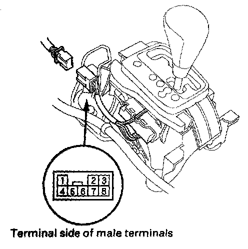 4. Check for continuity between connector terminals No.7 and No. 2. There should be continuity when shift lever pushed toward to upshift position (+), and no continuity with released shift lever to neutral position.