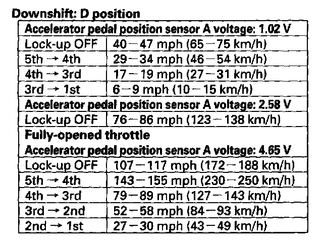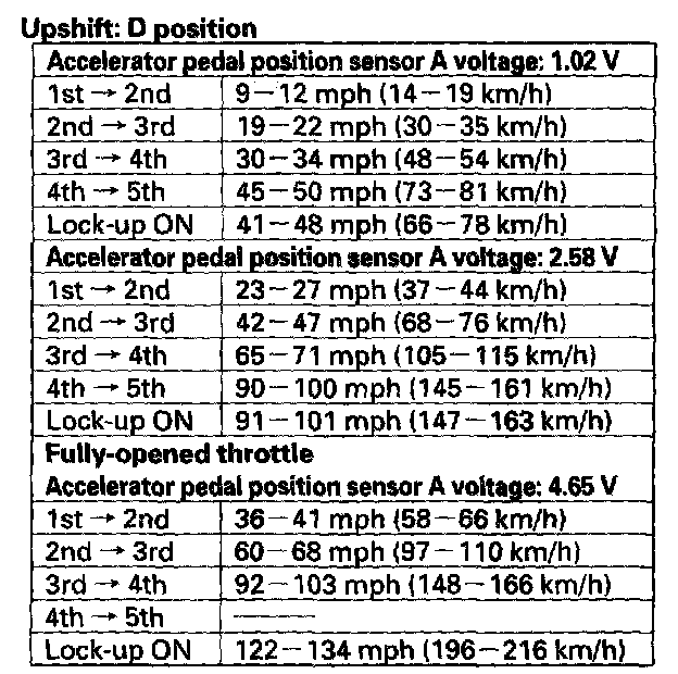 4. Test-drive the vehicle on a flat road in the D position. Check for abnormal noise and clutch slippage. While driving, check that the shift points occur at the proper speeds by monitoring the accelerator pedal position sensor voltage with the HDS and comparing your shift point speeds and voltage to those in the table. (The accelerator pedal position sensor voltage represents the throttle opening.)