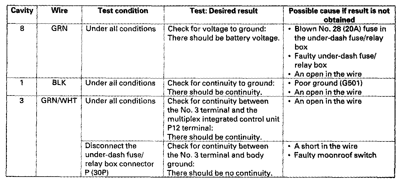 Moonroof Control Unit Input TestBefore troubleshooting the moonroof circuit, troubleshoot the multiplex integrated control system using B-CAN System Diagnosis Test Mode A.