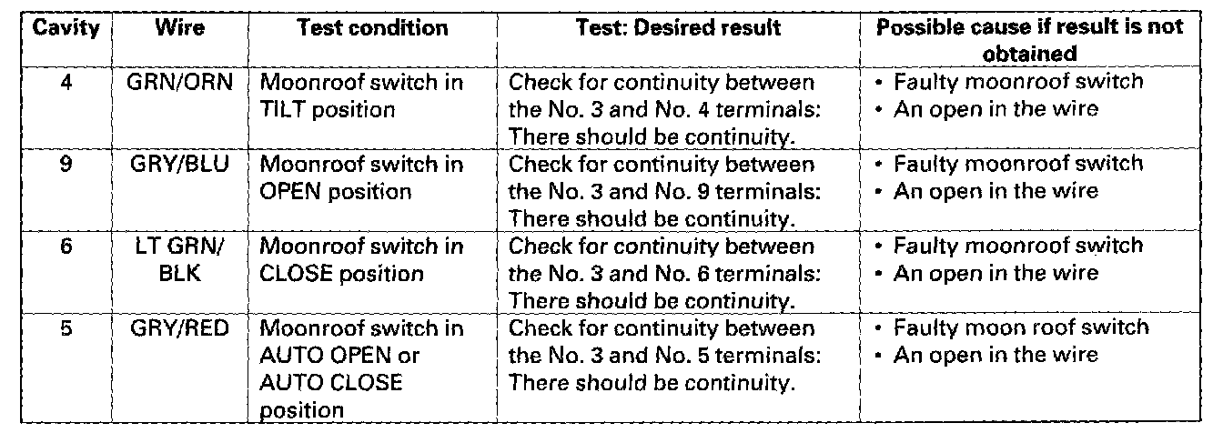 If the moonroof works OK manually, but will not work in AUTO, or reverse frequently (pinch detection), do the moonroof calibration before proceeding with the input test.