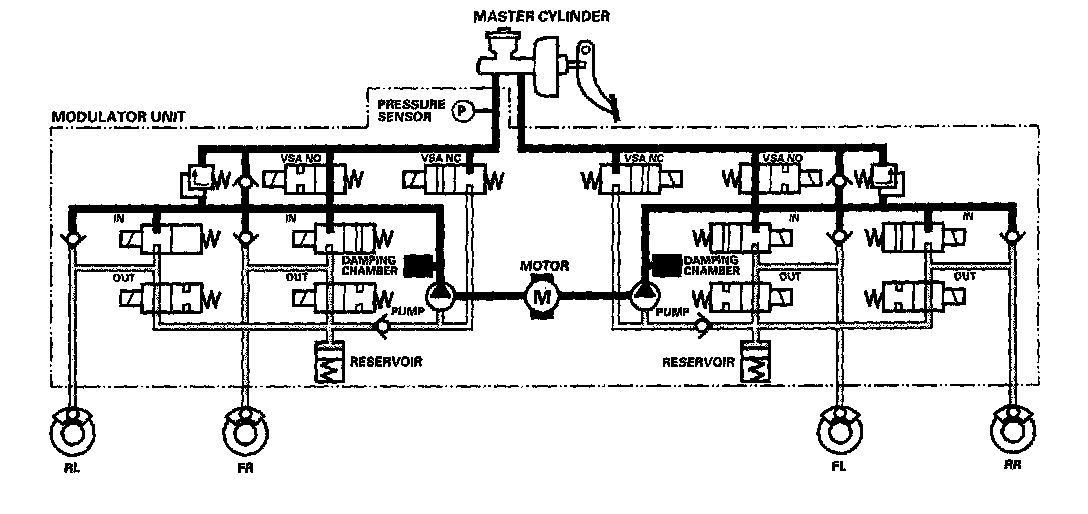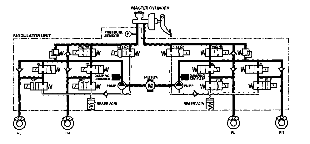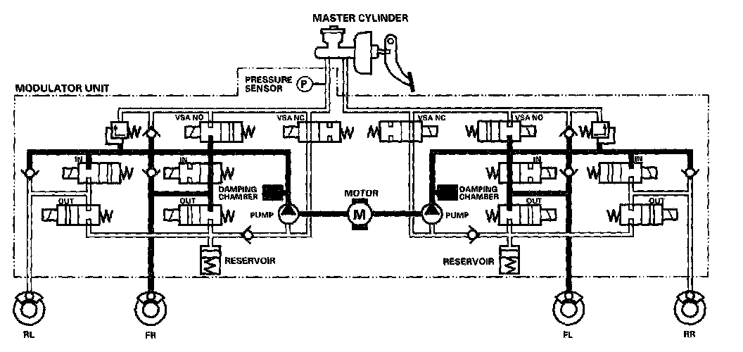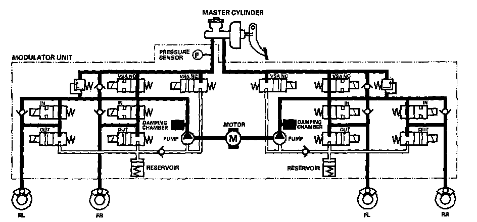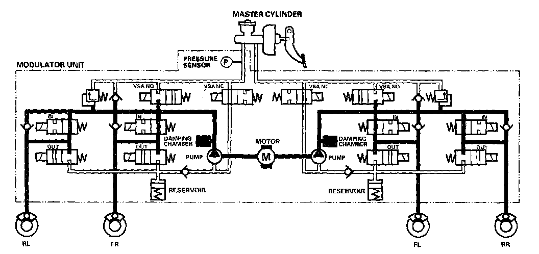 The reservoir and master cylinder fluid is pumped out by the pump, through the damping chamber, to the front and rear calipers.