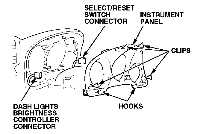 4. Disconnect the dash lights brightness controller connector and the SELECT/RESET switch connector.