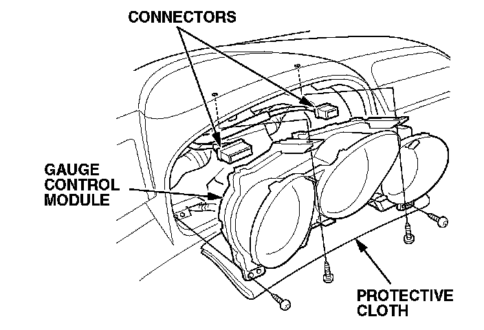 5. Place a protective cloth over the upper column cover, and remove the gauge control module/ combination meter assembly attachment screws.