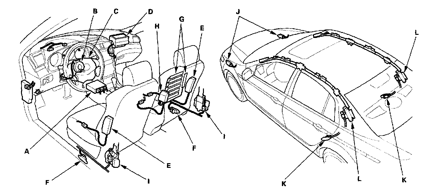 The side curtain airbags (L) are in each side of the roof. They help protect the head of the driver, front passenger, and passengers in the rear outer seats during a moderate to severe side impact. Side impact sensors (first) (F) in each front door sill, side impact sensors (second) (K) in each rear door sill, and the SRS unit detect such an impact and instantly inflate the driver's or the passenger's side curtain airbag. A side impact causes the side curtain airbag and the side airbag on the impacted side to deploy at the same time.