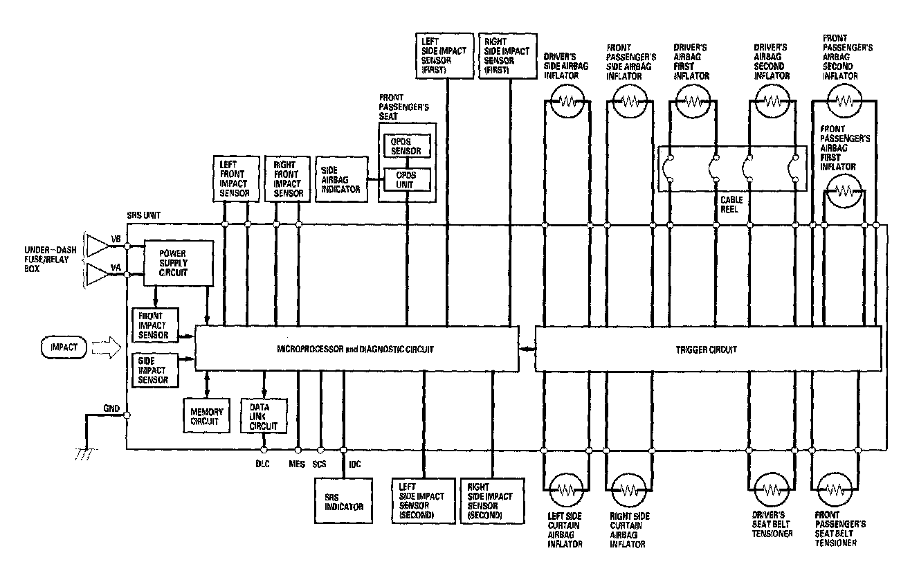 The main circuit in the SRS unit senses and judges the force of impact and, if necessary, ignites the inflator charges. If battery voltage is too low or power is disconnected due to the impact, the voltage regulator and the back-up power circuit, respectively, will keep voltage at a constant level.