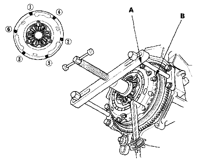 Be careful not to damage the pressure plate (A). Tighten (180° apart) the pressure plate mountings bolts (B) in a star pattern in several steps.