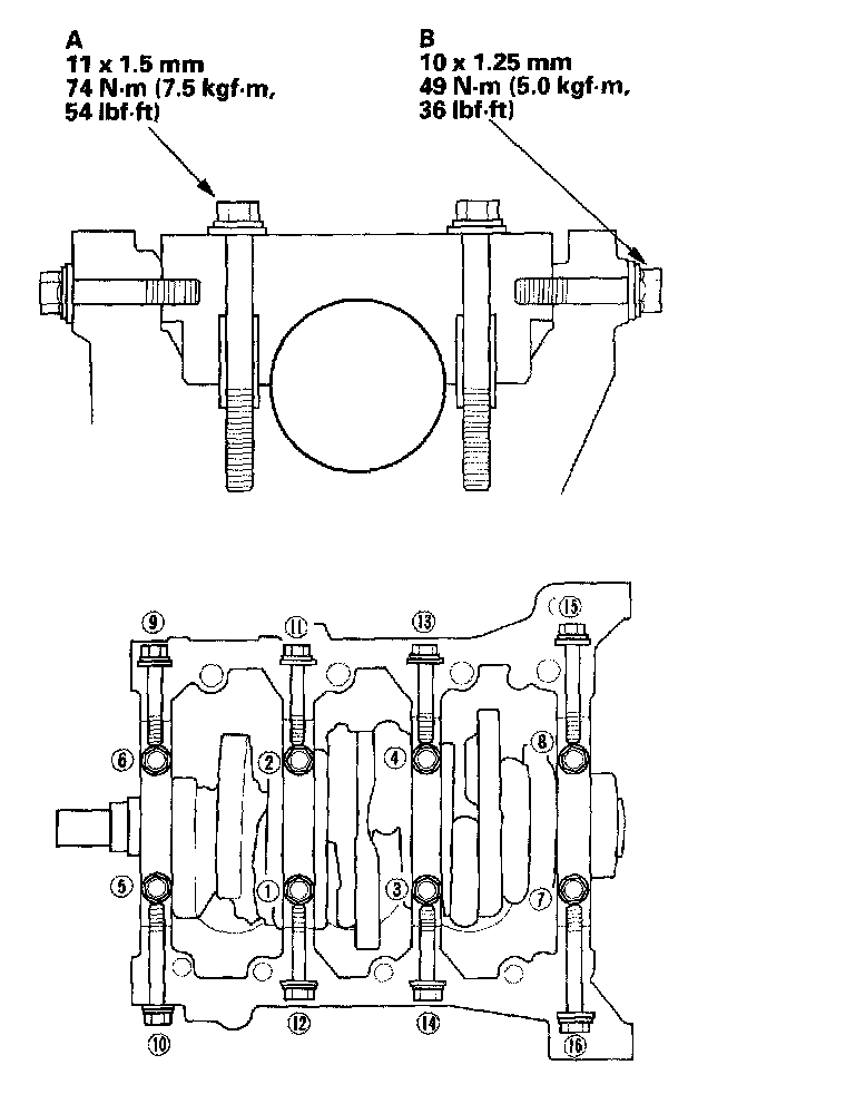 Tighten the bearing cap bolts (A), and then the bearing cap side bolts (B) to the specified torque in the sequence shown. Repeat the torque sequence again to assure the bolts are properly torqued.