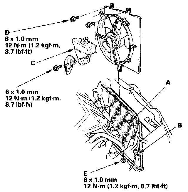 4. Remove the two bolts (D), and loosen bolt (E), then remove the condenser fan shroud