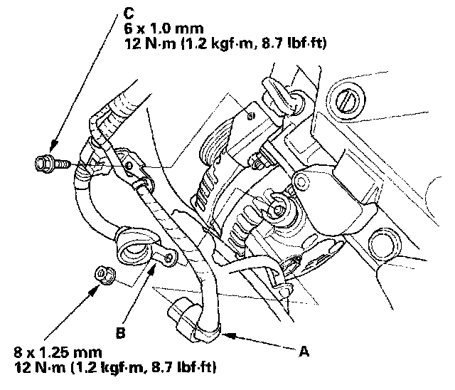 3. Disconnect the fan motor connector (A) and compressor clutch connector (B), then remove the reserve tank (C).