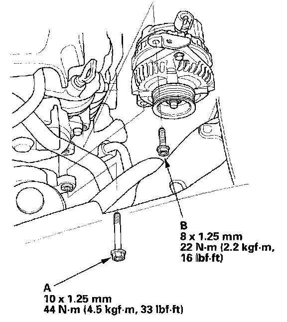 8. Remove the mounting bolt (A) and alternator bracket mounting bolt (B), then remove the alternator.