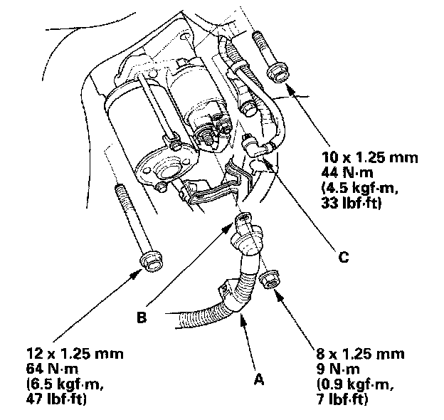 6. Disconnect the starter cable (B) from the B terminal, then disconnect the BLK/WHT wire (C) from the S terminal.